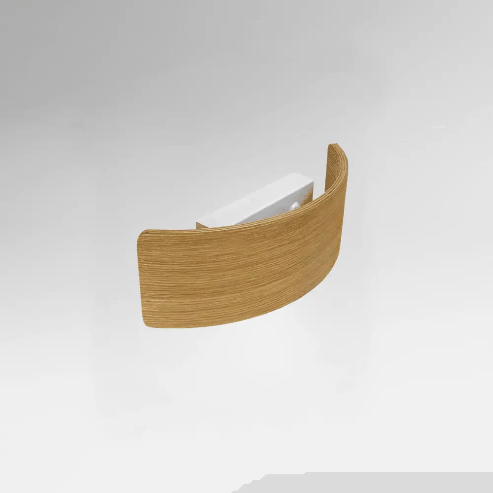 צמוד קיר עץ מכופף דגם “נועם” בעיצוב עץ בהיר, עם מערך לדים ותאורה מתכווננת .