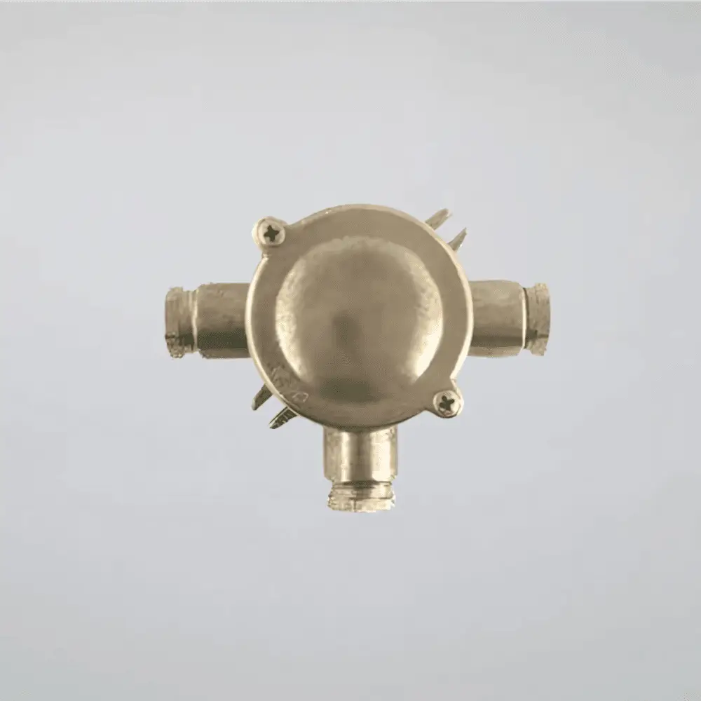 קופסת חיבורים מפליז, עם 3 כניסות לכבלי חשמל.